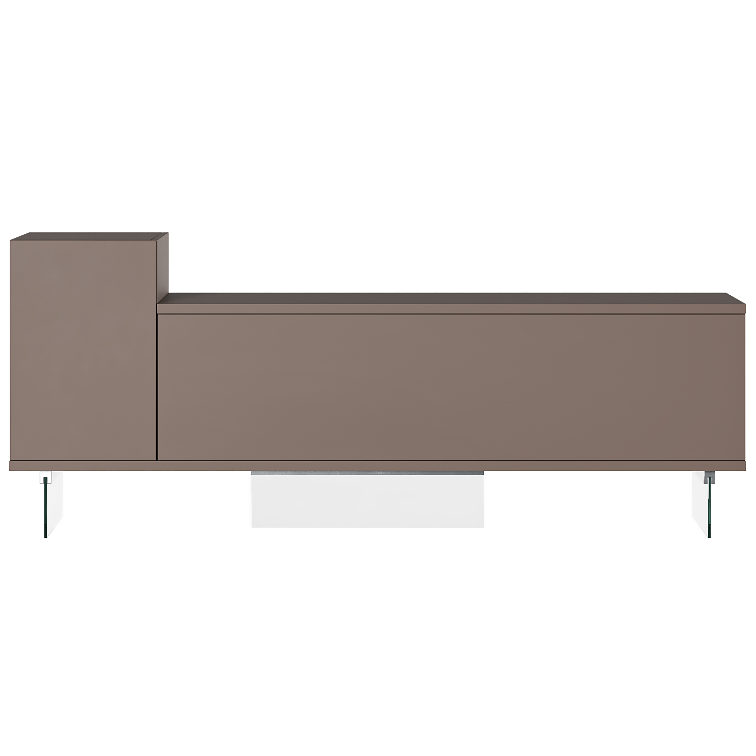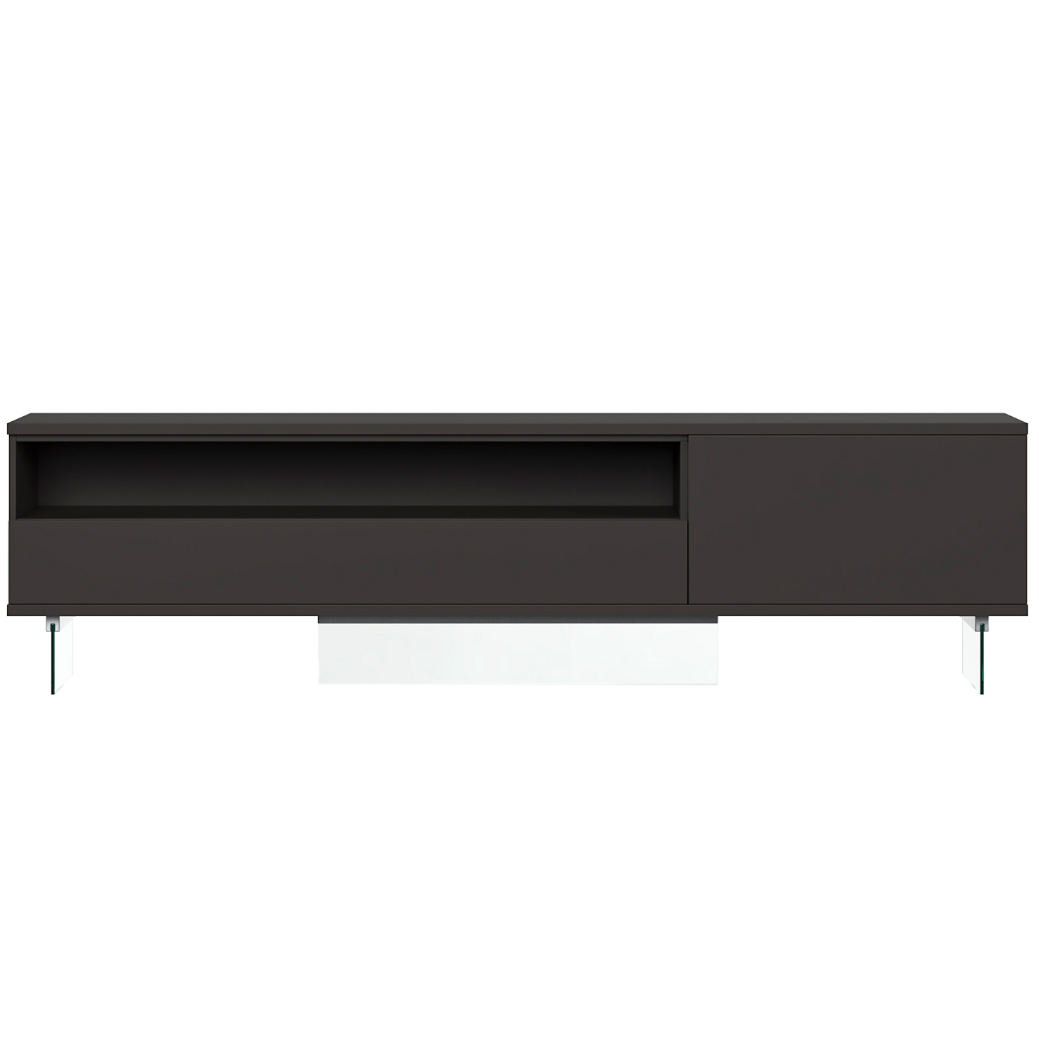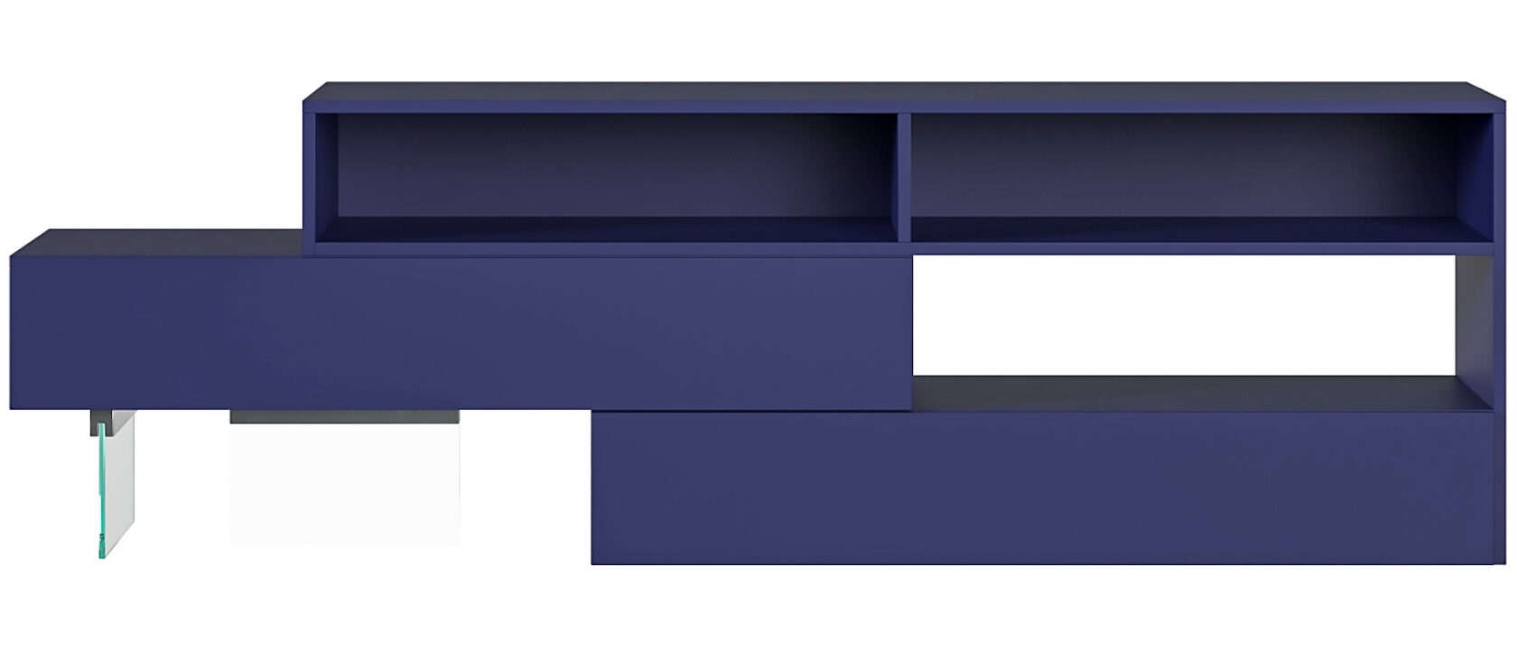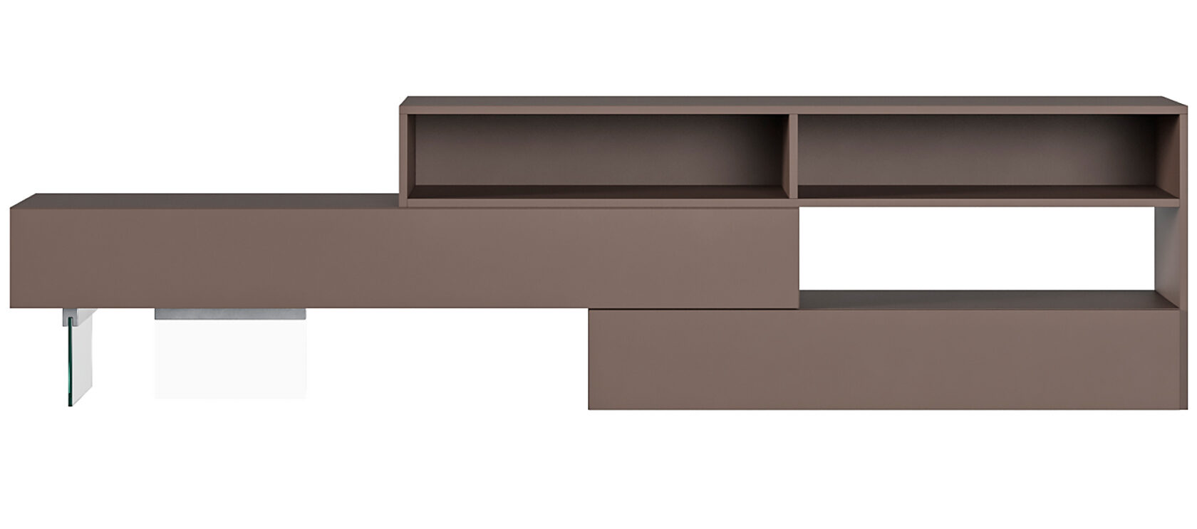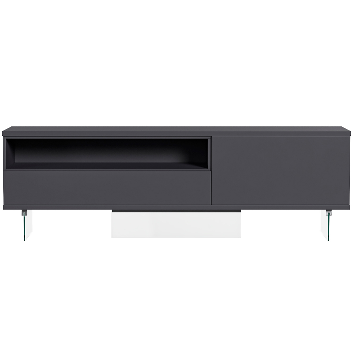 В верхней части тумбы предусмотрены закрытые секции, где можно скрывать различные предметы, обеспечивая аккуратный внешний вид. Центральная открытая ниша идеально подходит для размещения аудио- и видеоустройств, таких как DVD-плееры или игровые консоли. Нижняя часть тумбы предлагает вместительные внутренние отсеки, которые могут быть использованы для хранения журналов, книг или других необходимых вещей. Нижняя часть будто парит в воздухе из-за стеклянных опор.