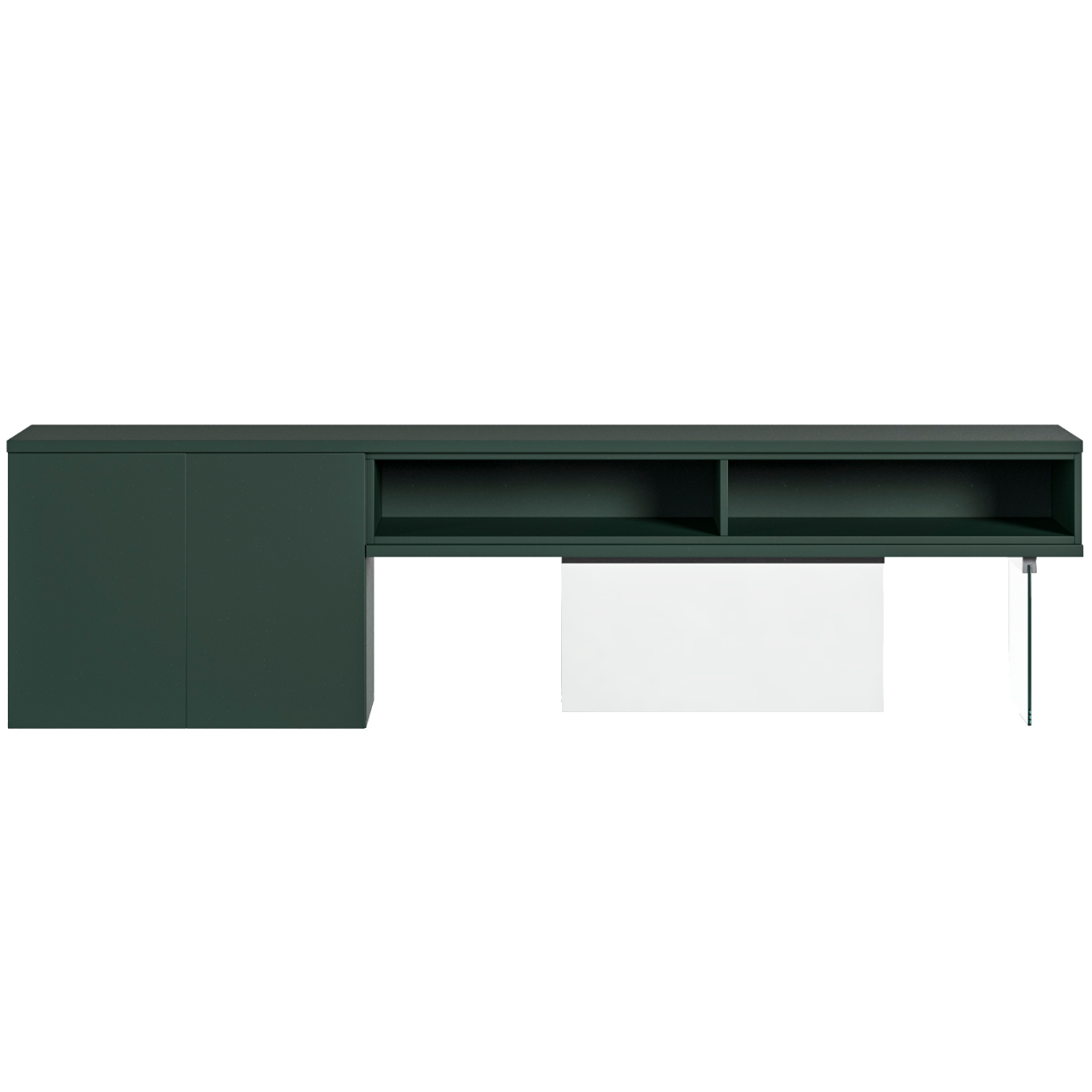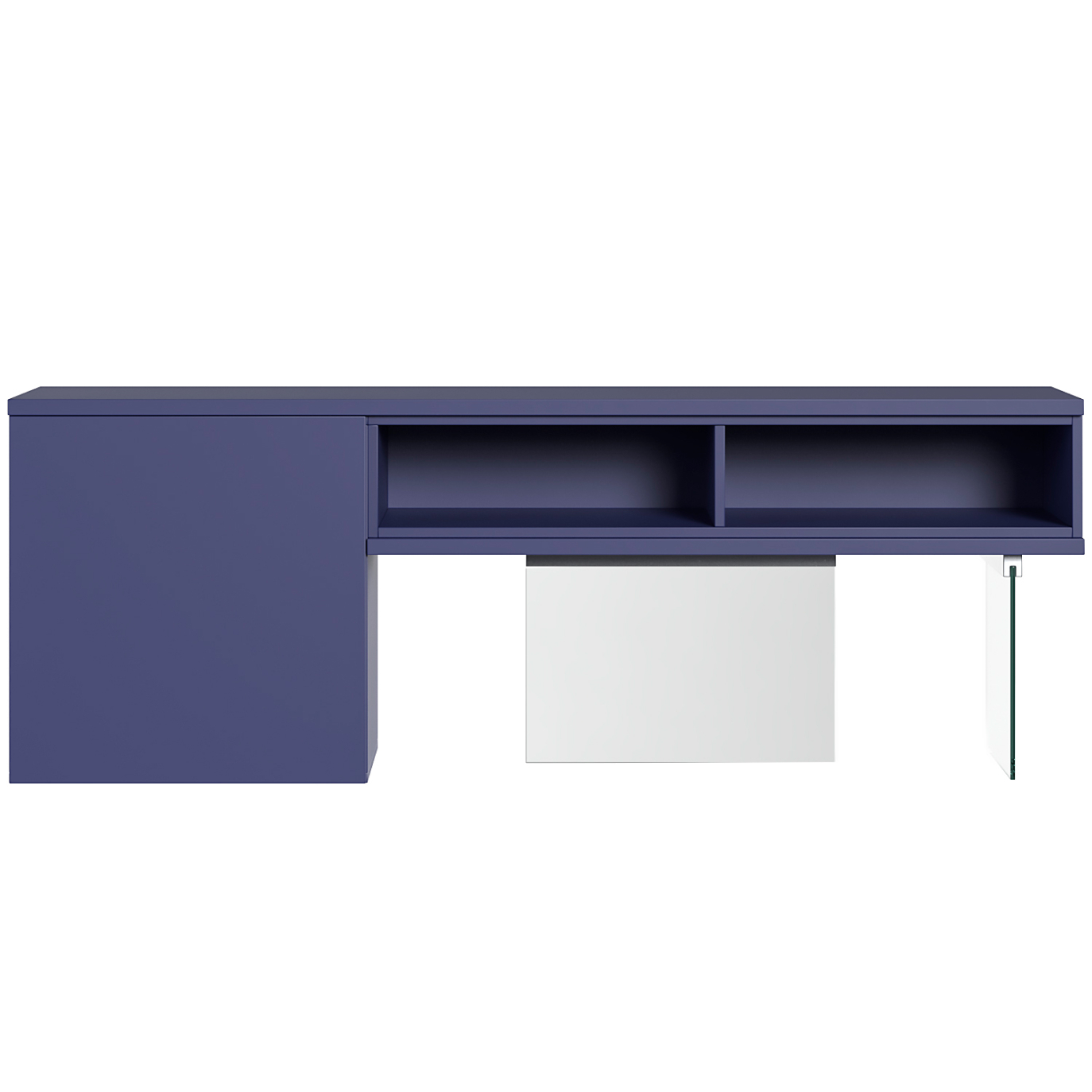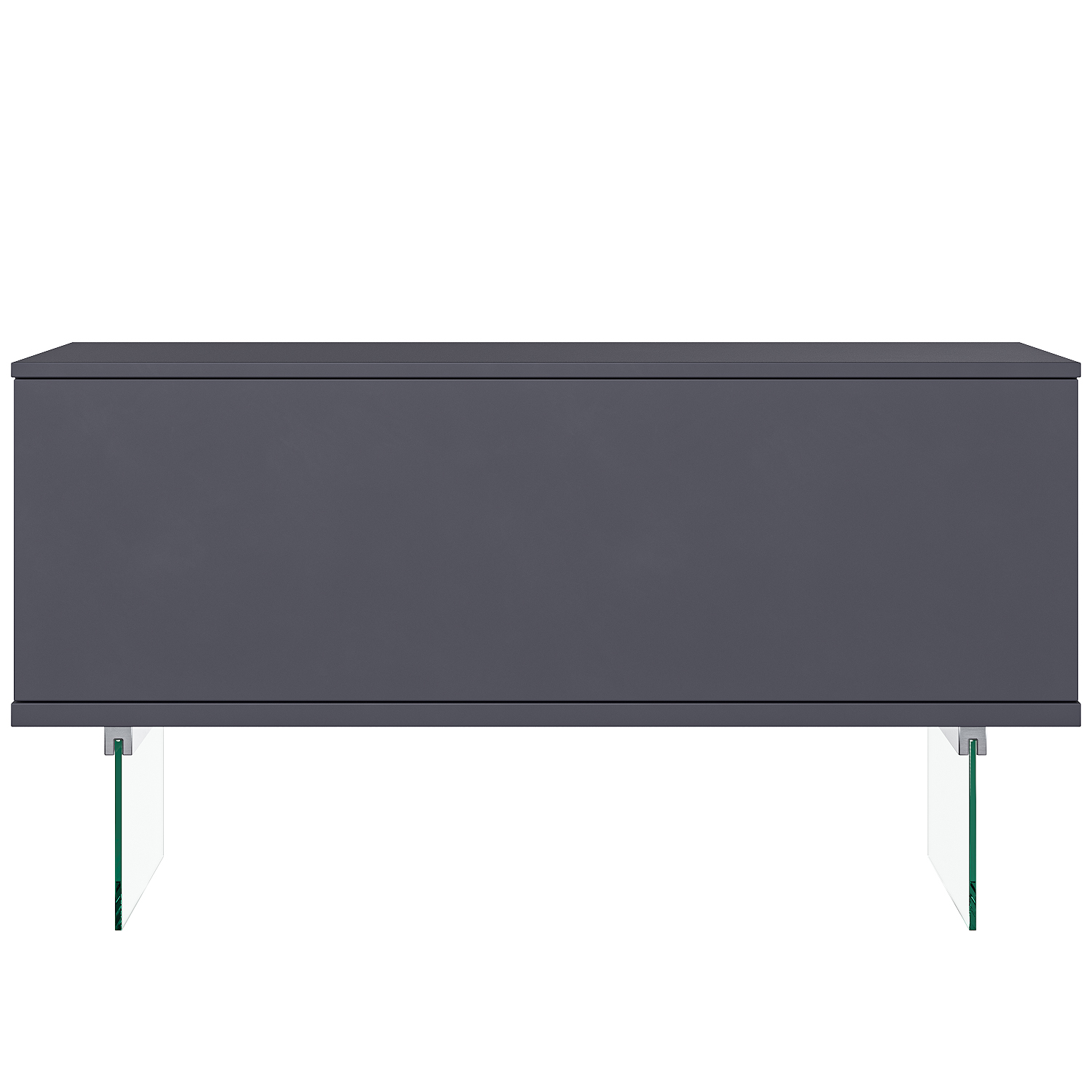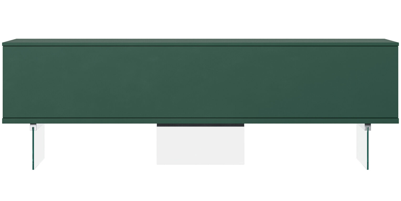 В верхней части тумбы предусмотрены закрытые секции, где можно скрывать различные предметы, обеспечивая аккуратный внешний вид. Центральная открытая ниша идеально подходит для размещения аудио- и видеоустройств, таких как DVD-плееры или игровые консоли. Нижняя часть тумбы предлагает вместительные внутренние отсеки, которые могут быть использованы для хранения журналов, книг или других необходимых вещей. Нижняя часть будто парит в воздухе из-за стеклянных опор.